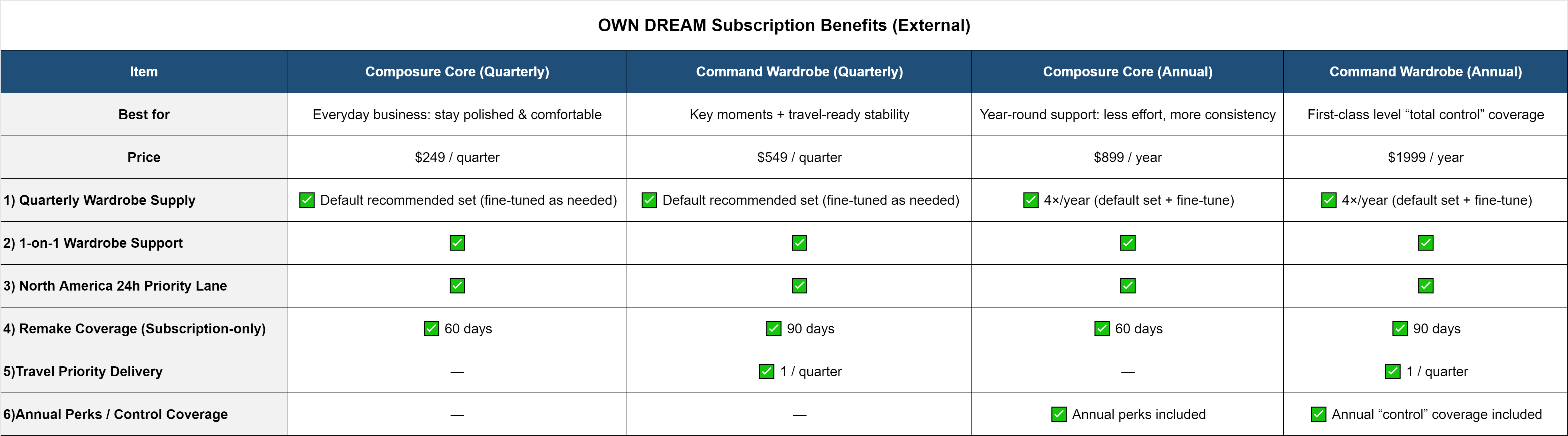 | 1) Quarterly Wardrobe Supply | ✅ Default recommended set (fine-tuned as needed) | ✅ Default recommended set (fine-tuned as needed) | ✅ 4×/year (default set + fine-tune) | ✅ 4×/year (default set + fine-tune) |